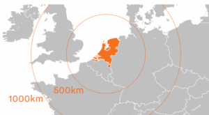荷蘭數百年來以貿易強國之姿聞名於世。得益於其優越的市場可及性和位居歐洲中心的地理位置,進出口貨物可輕鬆經由荷蘭流通。這樣優異的連結性可透過以下方式具象化:以荷蘭為中心畫出一個半徑500公里(約300英里)的圓,即可觸及1.7億消費者;若將範圍擴大至1000公里(約600英里),則更多達2.44億消費者。這2.44億消費人口正是歐盟主要消費力的核心所在。